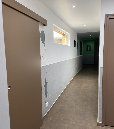 Le cabinet est alors aménagée en plusieurs salles dans l’optique d’évoluer un jour en “clinique vétérinaire” : accueil / salle d’attente, consultation, laboratoire, préparation à la chirurgie, chirurgie, imagerie, chenil chiens, chatterie et un chenil pour animaux contagieux.